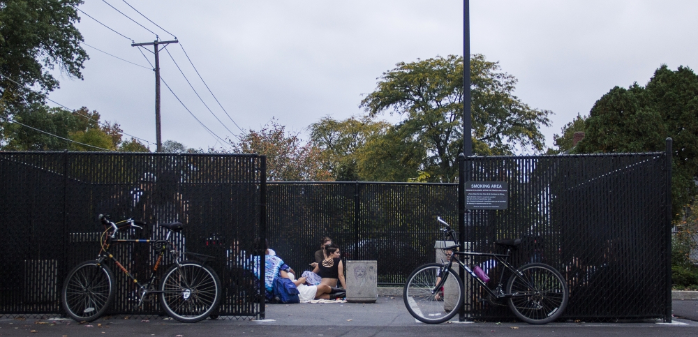 Kylie Kaiser smokes while sitting on the ground in the designated smoking area on campus. “The box” currently has no seating, so many students sit on the ground or on the trash receptacles.